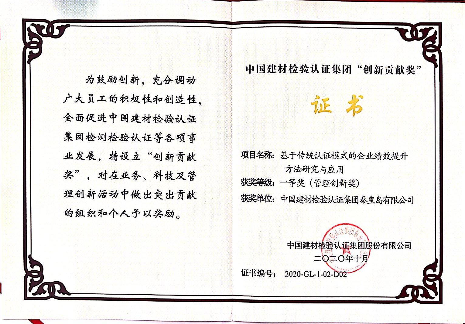 奖励名称:中国建材检验认证集团“创新贡献奖”