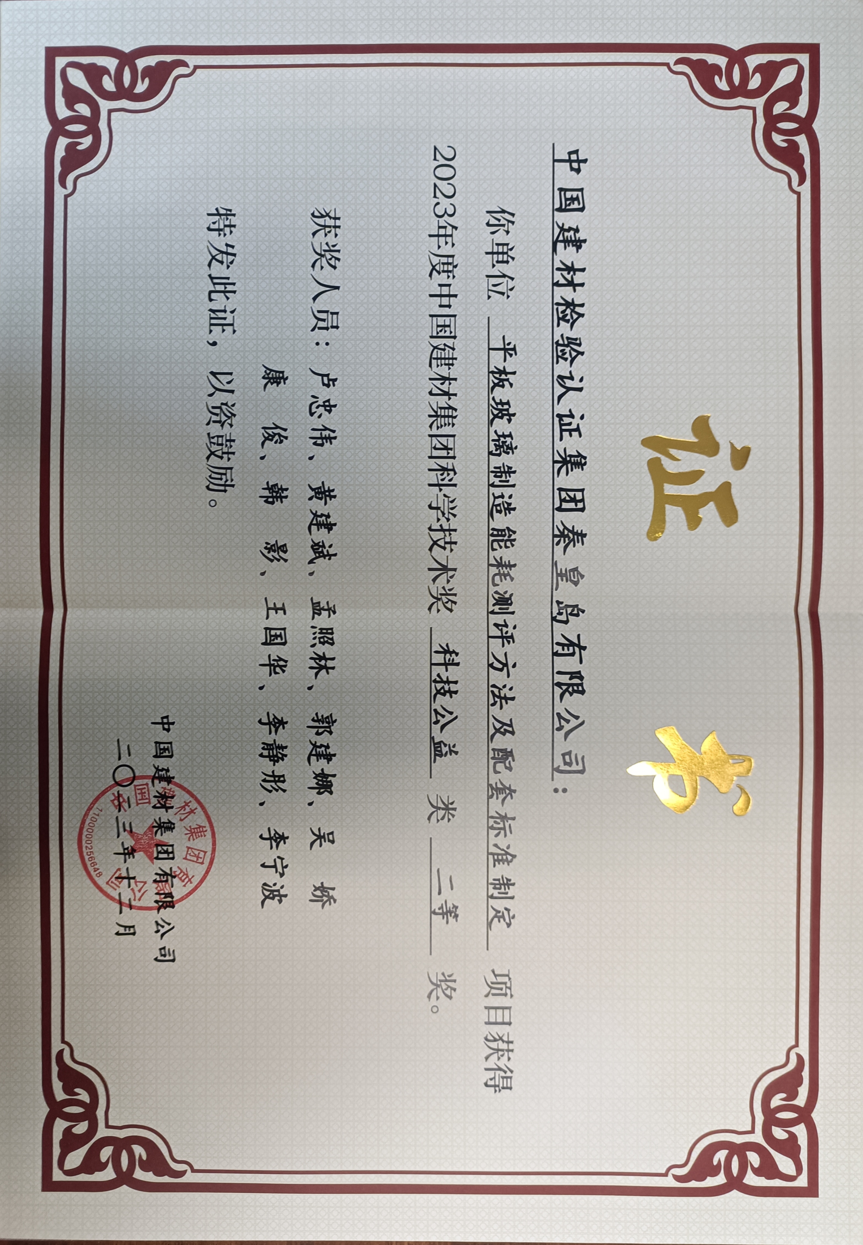 奖励名称:2023 年度中国建材集团科技公益奖(科学技术奖)